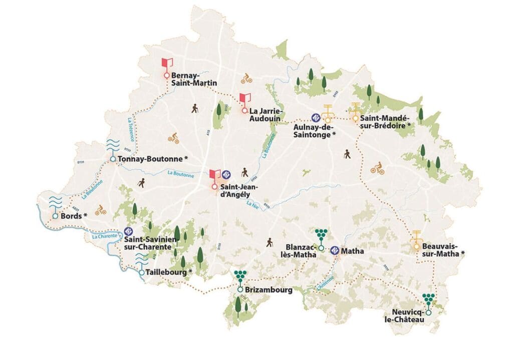 Partez sur les nombreux sentiers balisés qui jalonnent la campagne, entre forêts, champs, marais et rivières. Fontaines, lavoirs, puits et moulins s’inscrivent parmi les richesses du patrimoine champêtre des Vals de Saintonge. Route historique des Trésors de Saintonge,chemin de Saint-Jacques de Compostelle, itinérance dans le vignoble du cognac… organisez vos balades grâce à nos fiches détaillées et topo-guides.