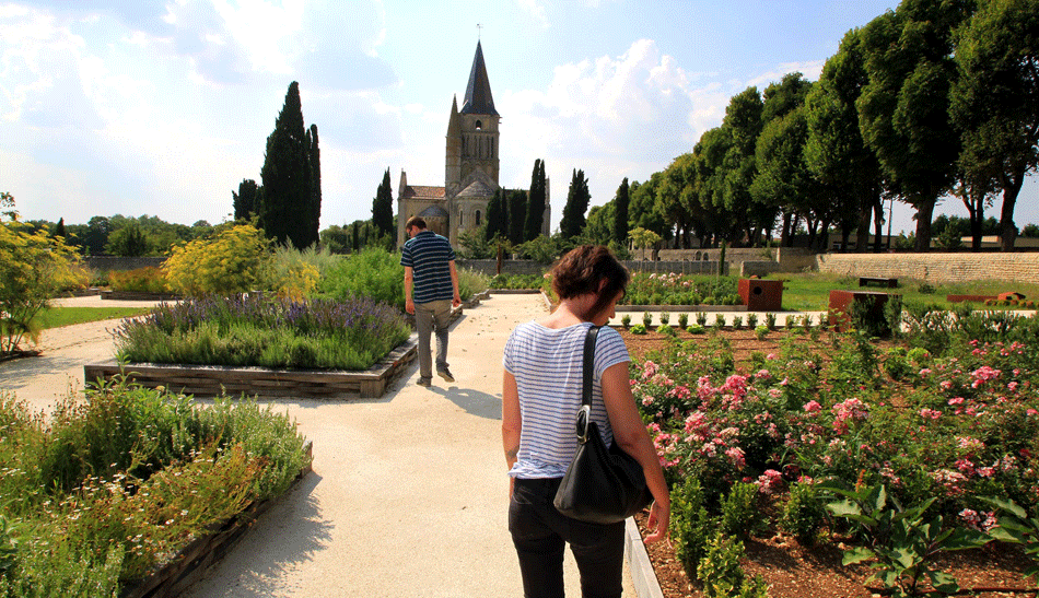 En autonomie, derrière le chevet de l’église, déambulez dans le jardin d’inspiration médiévale avec ses parcelles géométriques de plantes potagères et médicinales, auxquelles sont associées des répliques contemporaines de sarcophages au-dessus de vestiges de tombes plus anciennes.